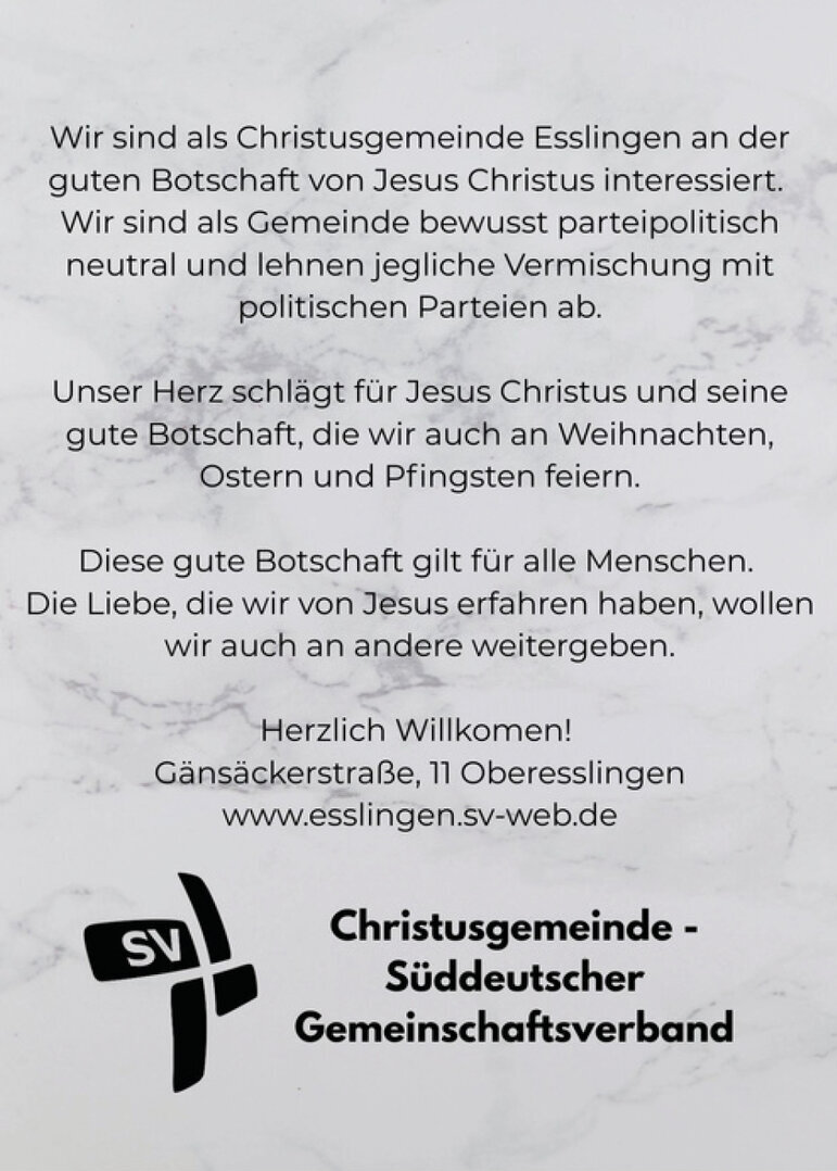 Am 5. April 2026 findet kein Gottesdienst in unserem Gemeindezentrum statt.